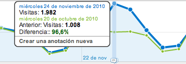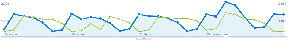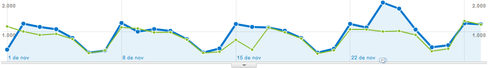 En el gráfico superior estamos comparando el período que va del 1 al 30 de noviembre de 2010, con el que va desde el 27 de septiembre de 2010, al 26 de octubre de 2010. No hace falta ser un experto para darse cuenta de que algo pasó a mediados del mes octubre (en verde) que rompió la tendencia natural.