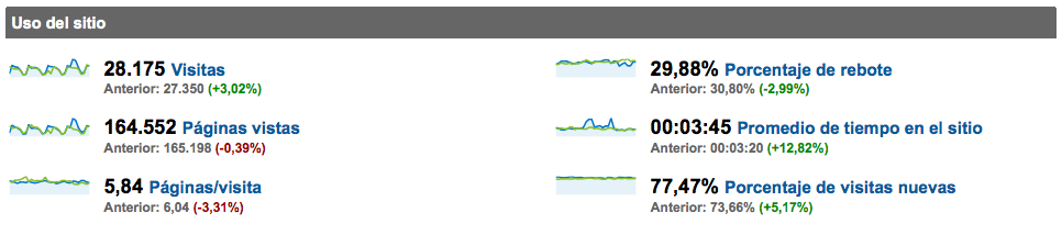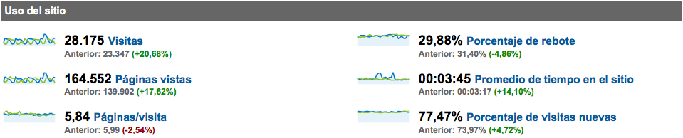 Importante: éstos números son los que representan el cambio real entre un mes y el otro, y son los que debemos considerar de cara al análisis de los resultados de las acciones de mejora de un site, sobre todo si son mejoras globales, como puede ser, por ejemplo, el rellenado correcto de los metas (es sorprendente la cantidad de sites cuyos metas son deficientes).