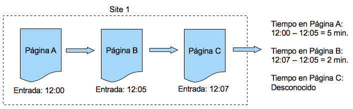Vamos a poner un ejemplo sencillo: supongamos que entramos a un site por la página A, luego pasamos a la página B. Cuando entramos en la página A, son las 12:00, y cuando se carga la página B, son las 12:05. Analytics, entonces, hace la siguiente resta: 12:05 – 12:00, y determina que en la página A hemos estado 5 minutos.