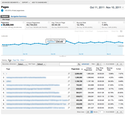 Las herramientas de análisis nombran de muchas formas lo que en la mayoría de los casos viene a ser lo mismo: un listado, ordenado de forma descendente según el número de vistas o de visitas de las páginas del site. Dentro de ese informe, el dato estrella es el porcentaje de rebote por página, es decir, el porcentaje de veces que cada página ha sido la única que se ha visto del site… El dato es muy poderoso. De un vistazo podemos encontrar las páginas que necesitan optimizarse para reducir el porcentaje de rebote global.