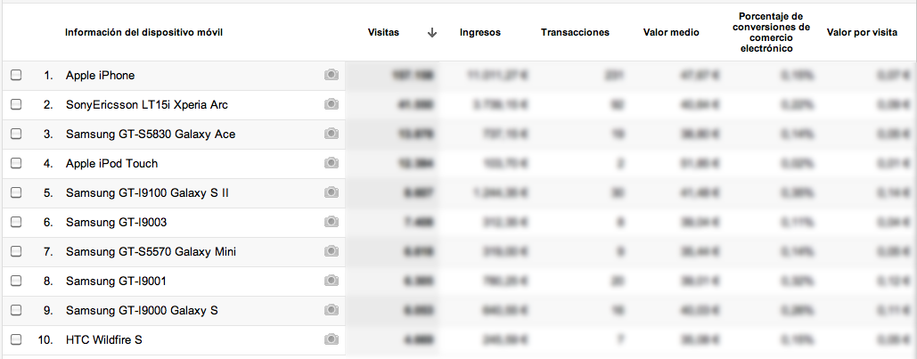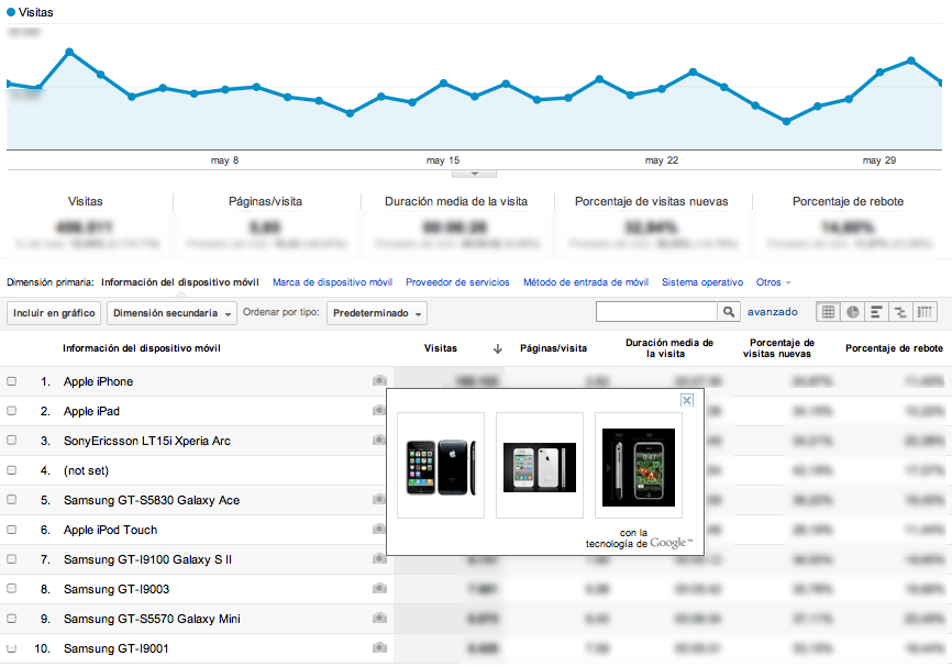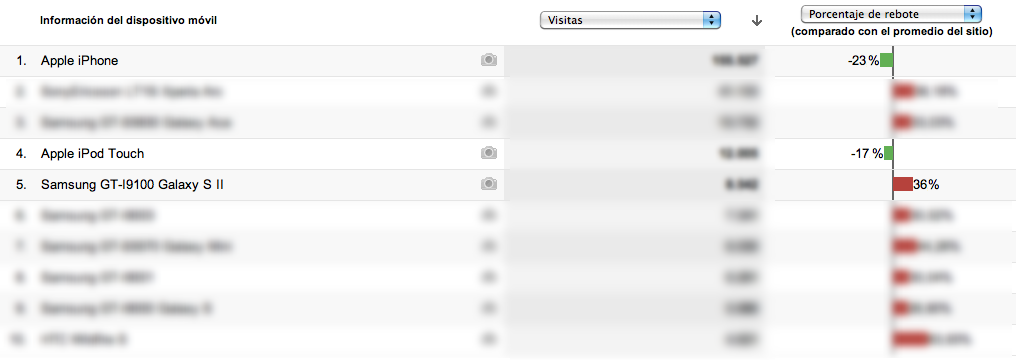 La segmentación básica es la que se hace por dispositivo: todos las métricas generales vistas anteriormente pueden analizarse para cada uno de los móviles utilizados para acceder al site.