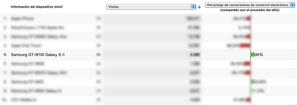 Por ejemplo: una vez detectados los principales dispositivos móviles por volumen de visitas (o de ingresos, dependiendo de la estrategia), se pueden hacer segmentos que muestren únicamente el comportamiento de los usuarios de dichos dispositivos, tanto globalmente, como de forma separada.