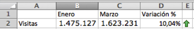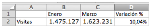 Por ejemplo, si las visitas en enero fueron 1.475.127, y en marzo fueron 1.623.231, ¿sabríais decir cual es la variación porcentual de las visitas entre enero y marzo?