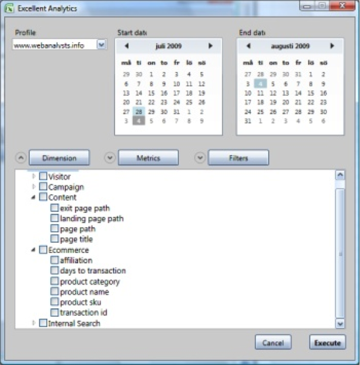 Finalmente, actualizar las consultas es muy simple. Una vez definidas, tan sólo debemos seleccionar la celda en la que se encuentra la consulta, y pulsar sobre “Update Query”, en las opciones de Excellent Analytics. Entonces podremos cambiar los parámetros correspondientes (el período, por ejemplo).