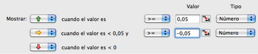 De las opciones disponibles, se selecciona “Nueva regla…» –> «Conjunto de iconos”… Se seleccionan las flechas, y se configura la regla como sigue: