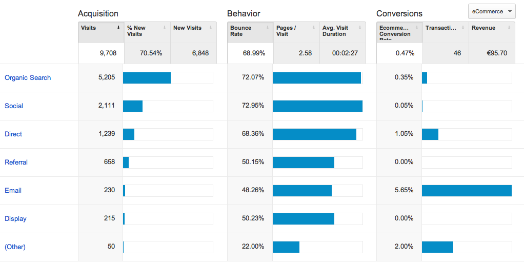 De esta forma, podemos comparar los canales sin quedarnos sólo con lo típico (visitas, porcentaje de rebote y conversiones). Estamos tan obsesionados con el porcentaje de conversiones, por ejemplo, que solemos considerarlo como la clave de todo. Pero muchas veces dicho porcentaje es sólo una de las caras de la moneda (y en analítica las monedas tienen más de dos caras). Es frecuente encontrarse con canales que tienen un porcentaje de conversiones de comercio electrónico inferior a otro, pero cuyo volumen de ingresos es incomparablemente mayor, porque generan muchas más visitas y transacciones.