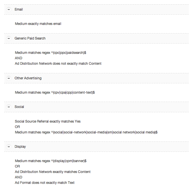 Así que para facilitarnos la vida a nosotros mismos, es muy recomendable etiquetar nuestras campañas siguiendo las reglas expuestas en el artículo «Default Channel Definitions», de Google: http://goo.gl/ndbfqP